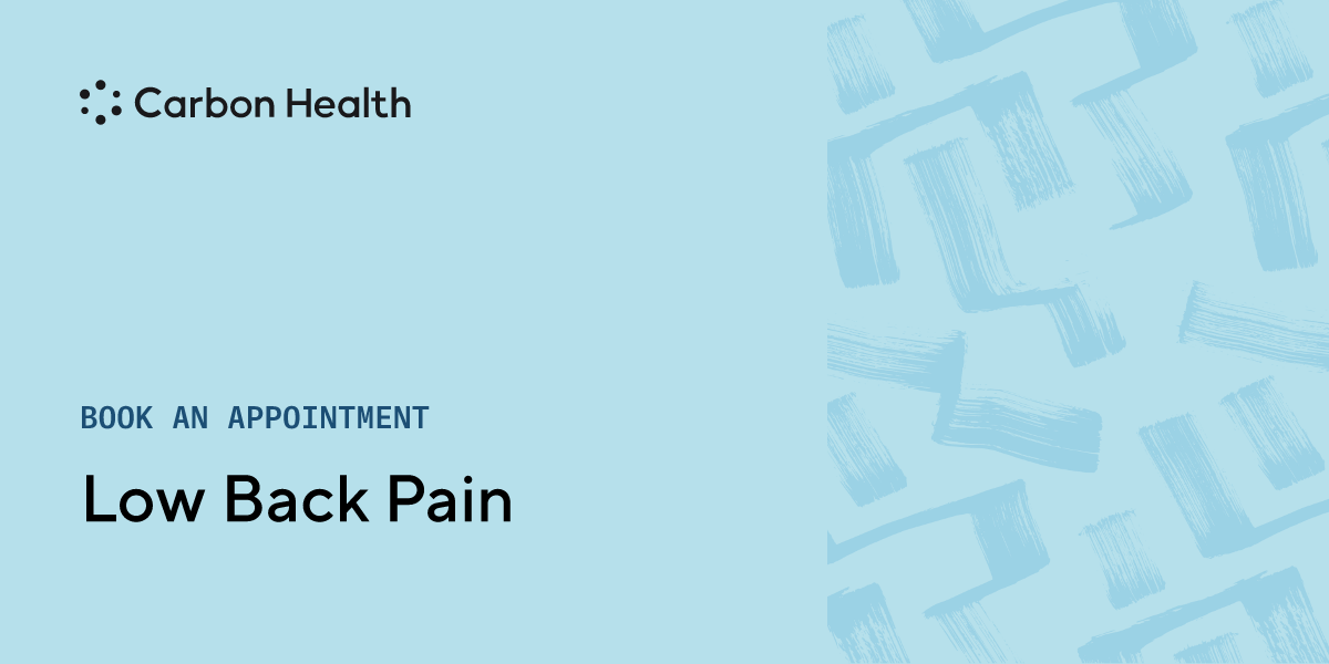 Low back pain is any sort of pain or discomfort in the small of the back, the area between the chest and thighs. It's often a result of injury or strain due to over-exertion. If you're suffering from chronic or severe lower back pain, schedule a visit at a nearby Carbon Health.