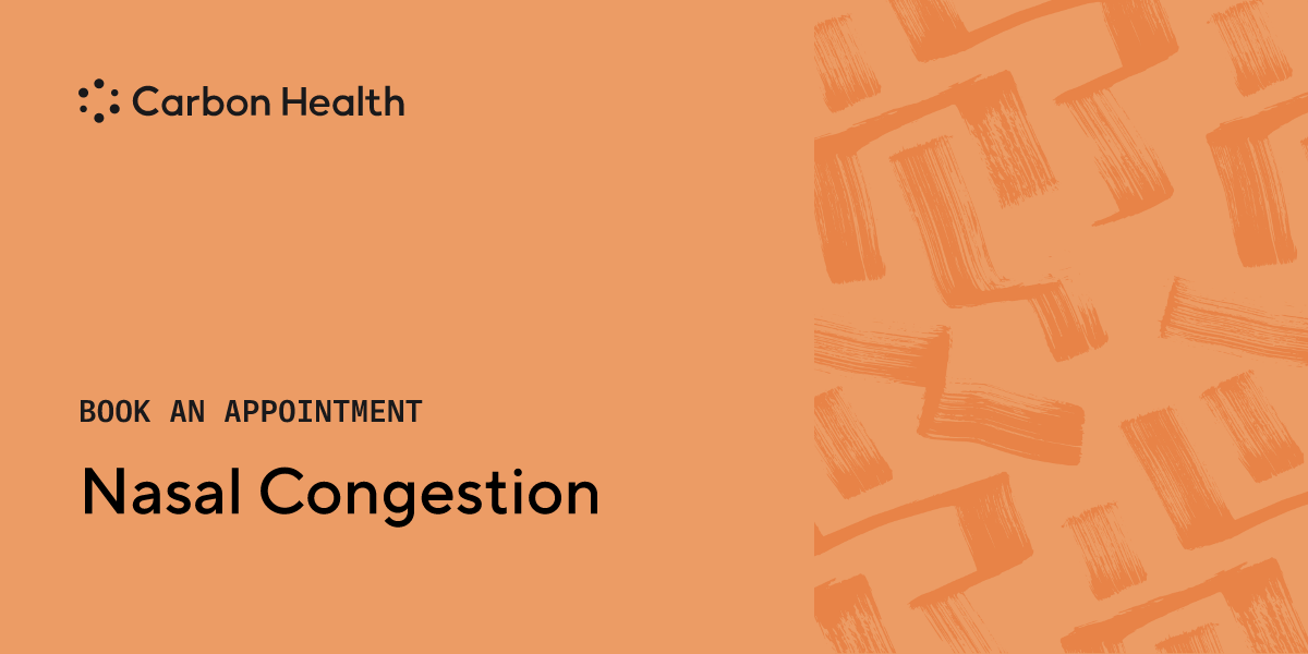 Nasal congestion is a swelling of tissue and blood vessels around your nose that makes it feel stuffy and clogged. It's almost never serious, typically a result of allergies or minor colds and flu. Schedule an appointment with a nearby Carbon Health if it lasts longer than a week.
